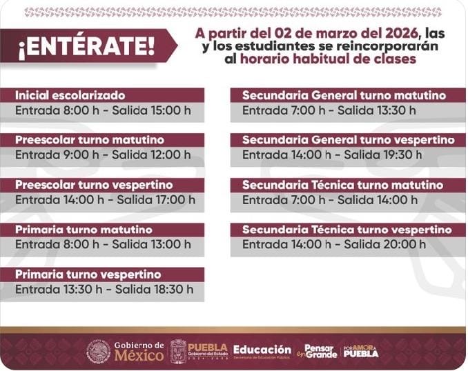 Tepeaca de Negrete, Pue.- Este lunes 2 de marzo estudiantes de educación básica y media superior en Tepeaca y el resto del estado poblano, regresan a su horario normal tras concluir el horario de invierno.